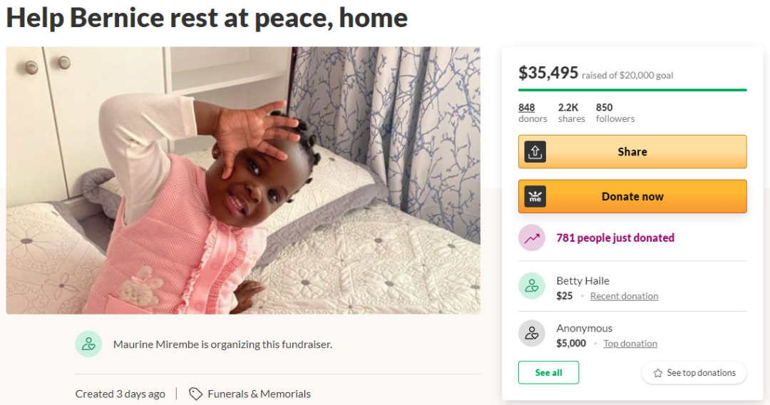 现在莫里恩只想将孩子的遗体带回乌干达入土为安,网上也为柏妮丝设立了GoFundMe,现已经筹集了$35495刀。