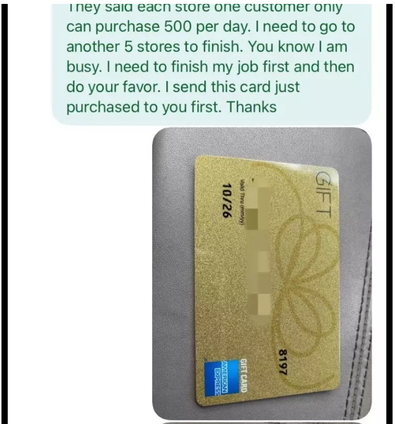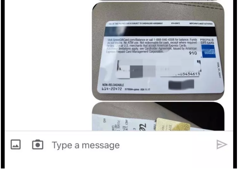 不过第二天,本月9日时,周先生查看银行帐户,就发现支票的这笔钱已经出现在帐户中了,他便对此感到放心问这位女生如何给她钱。对方表示因为zelle转帐一天只能转500元,她因为收拾行李回美也急需钱,希望周先生将这些钱买成美国运通公司的礼卡,拍照发给她这样更快。