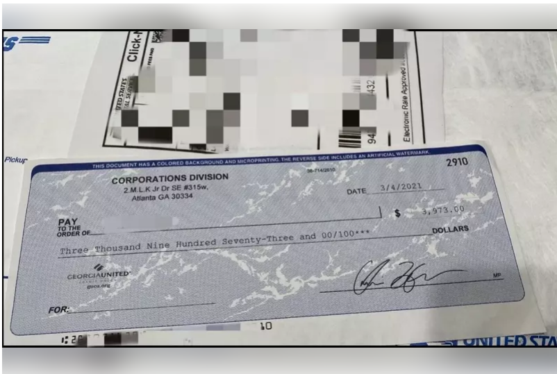 一周后,周先生便收到一张支票,这张支票是由亚特兰大市一处政府机构开出,写有3973元。这位女生表示,希望周先生存入这张支票,减掉押金700元后,剩下的3200还给她即可。周先生表示可以,但要等存入支票到帐之后才能还,对方表示同意。
