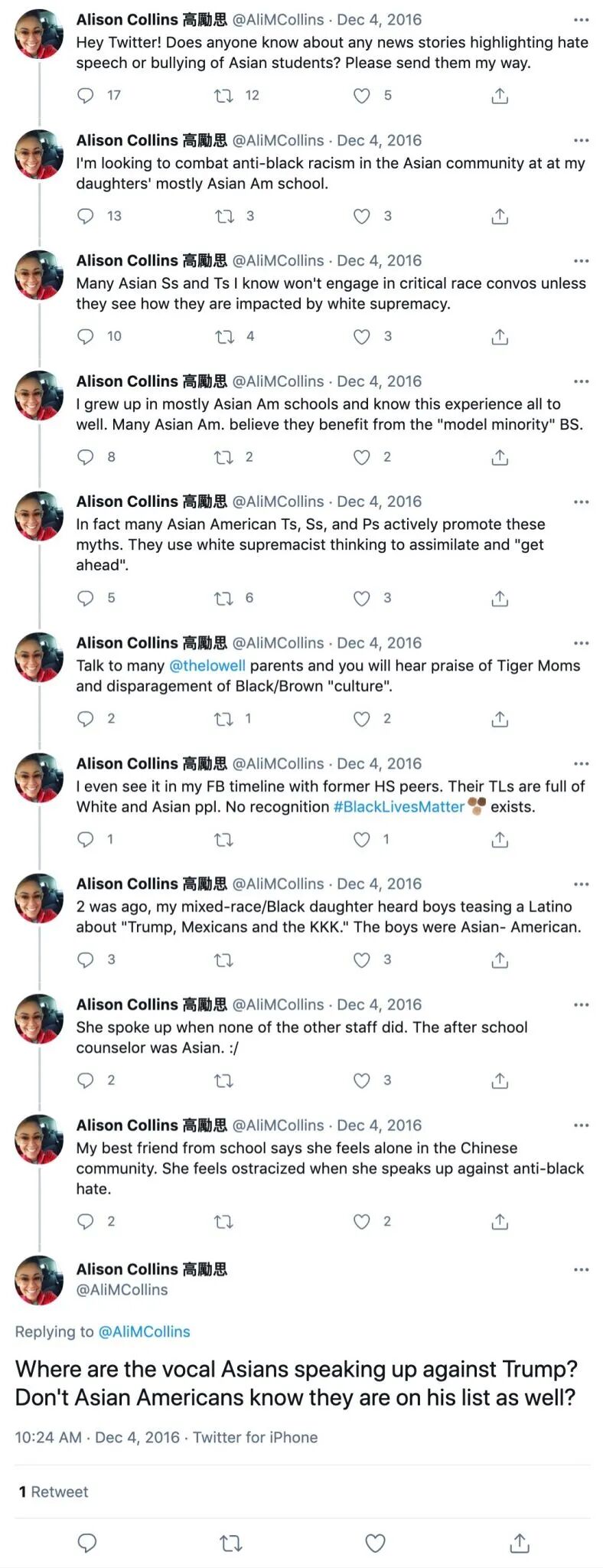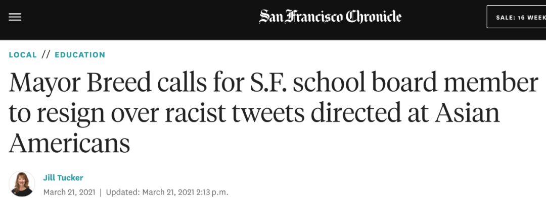 旧金山市长等多名民选官要求辱华校董辞职周六,包括市长Breed、州议员和集会所有监事在内的多位旧金山高层民选官员因一条2016年针对亚裔美国人的种族主义推文,要求旧金山一名学区校董成员辞职,这在以前是从来不敢想象的。 △校董事会副主席Alison Collins的推文引发争议。