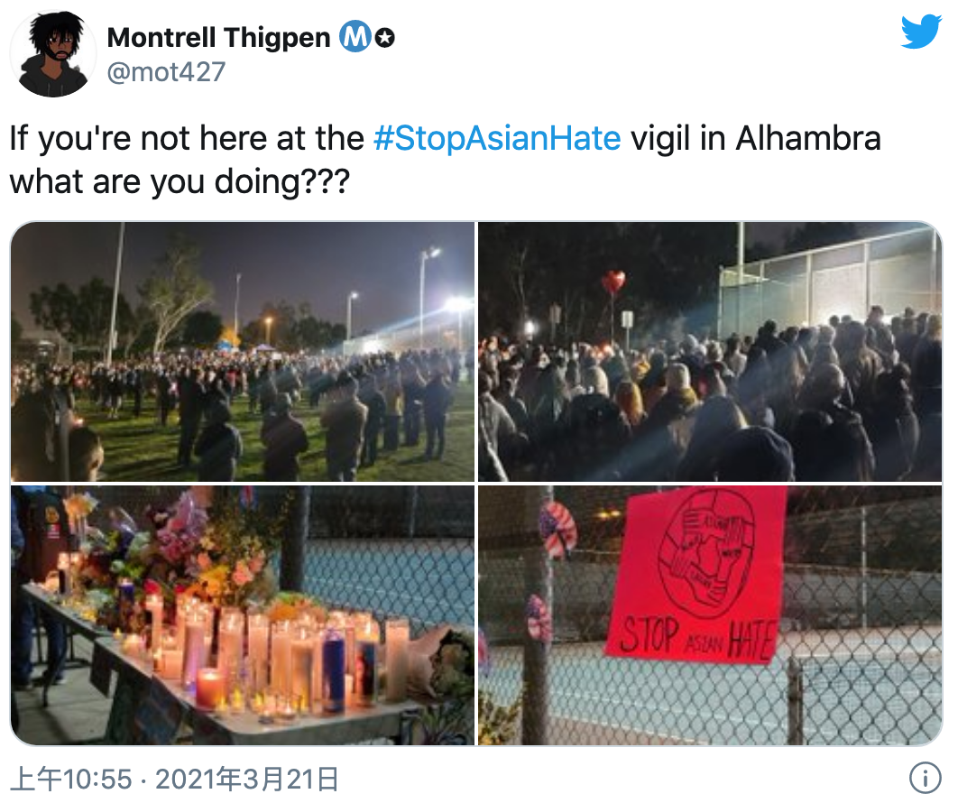 洛杉矶 周六晚,洛杉矶的亚裔们聚集在圣盖博大剧院和Alhambra,一起为在亚特兰大枪击案中的遇难者守夜。 (图片来源网络,版权属于原作者) (图片来源网络,版权属于原作者) (图片来源网络,版权属于原作者) (图片来源网络,版权属于原作者)