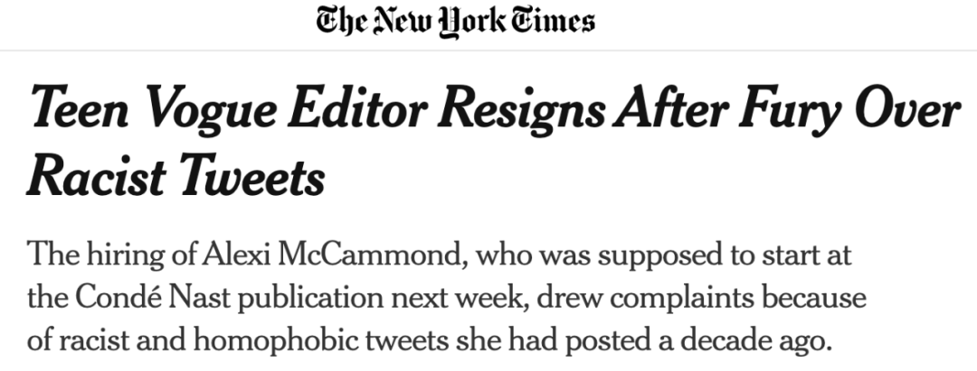《Teen Vogue》时尚编辑推文有辱亚裔,引咎辞职 现年27岁,计划近日开始担任《Teen Vogue》主编的Alexi McCammond,原是华盛顿新闻网站Axios的政治记者。但走马上任前《Teen Vogue》工作人员公开谴责McCammond女士10年前发布的种族主义和同性恋推文后,目前她已经引咎辞职。