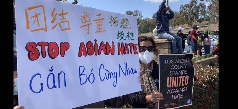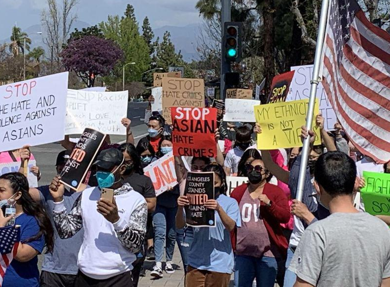 3月21日中午在圣盖博谷东区的钻石吧市(Diamond Bar)举办集会示威抗议活动,持续两个小时,参与者包括各族裔民众千余人,民选官员也到场声援。