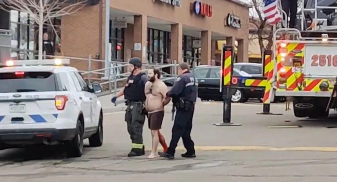 下午3点30分左右,警察押着一名戴着手铐、赤裸上身的男子走出大楼。该名男子的一条腿似乎正在流血。