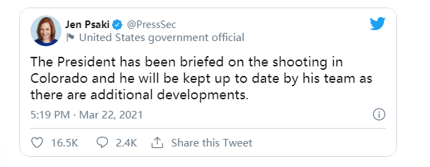 白宫新闻秘书莎琪(Jen Psaki)在推特上表示,拜登总统已经听取了博尔德枪击事件的简报,会随时了解进一步的发展情况。