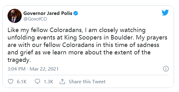 科罗拉多州长贾里德·波利斯(Jared Polis)在推特上说,他一直在关注事件的最新进展。波利斯说,“我们会跟进这起悲剧的最新情况,在这个悲痛的时刻,我与我们的科罗拉多同胞一起祈祷。”