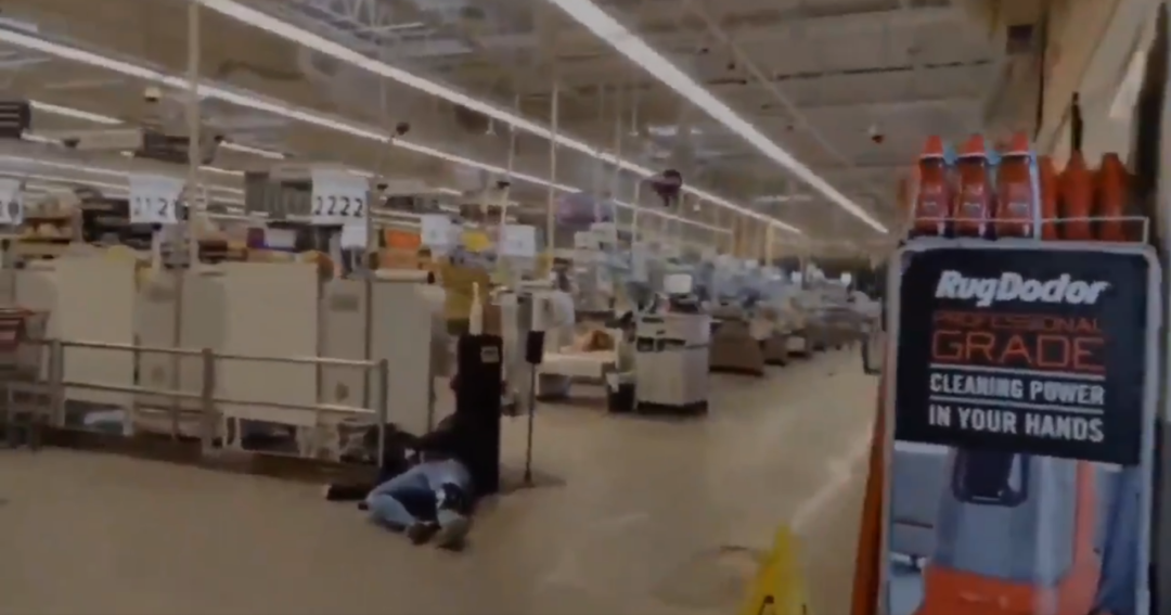 话音刚落,男子的镜头扫到超市内部,一名男子似乎已经中弹,倒在自动结账台前一动不动。