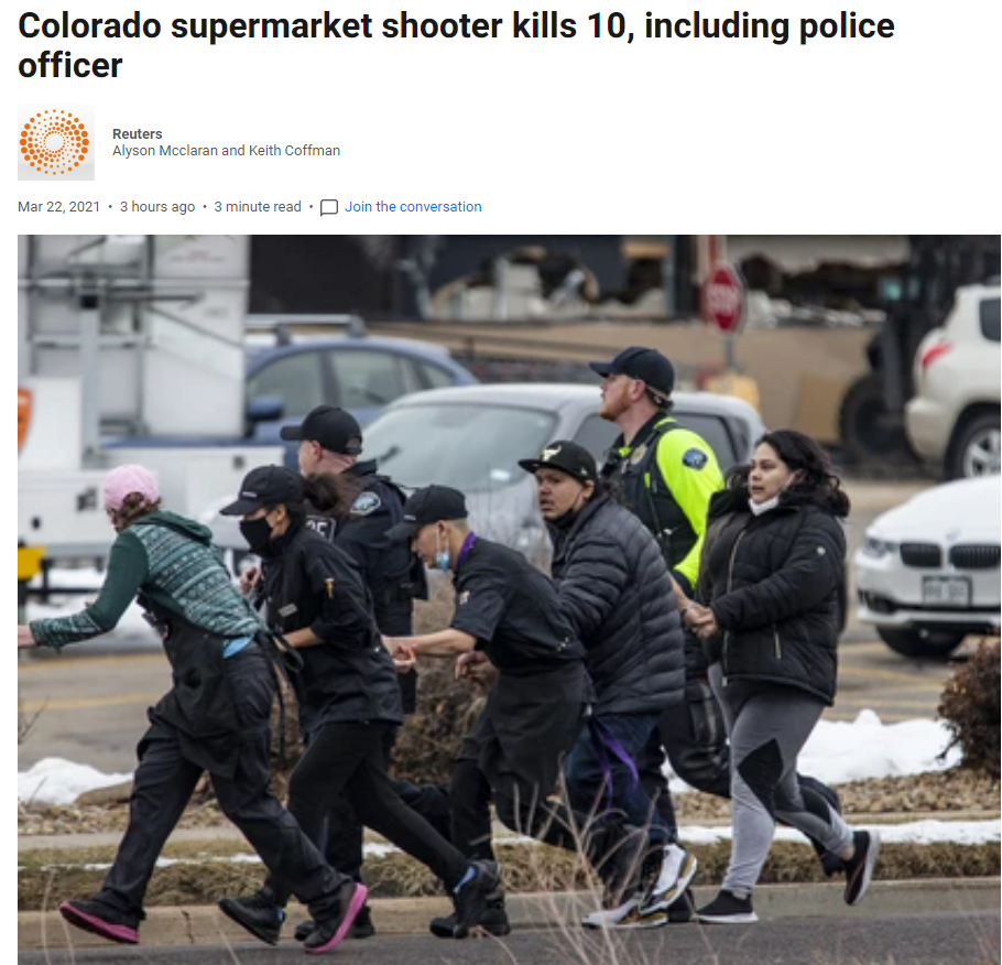 当地时间3月22日下午2点30分,美国科罗拉多州博尔德市(Boulder)一家超市King Soopers发生大规模枪击事件。
