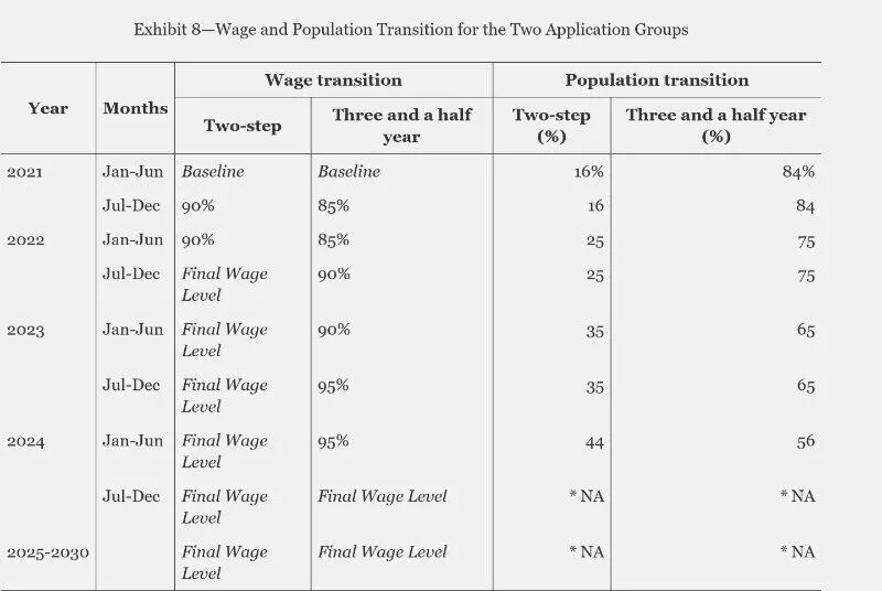 新规执行以后将不会马上要求按照工资标准100%的执行。按照申请人群的不同,分别给出了不同过渡时间,最低工资线比例也有所不同: