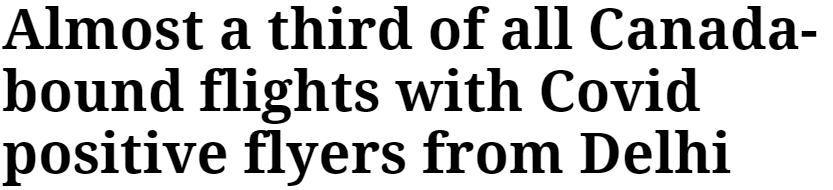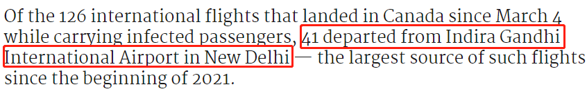 126架搭载着确诊乘客落地加拿大的国际航班,有41架从印度新德里英迪拉·甘地国际机场出发。