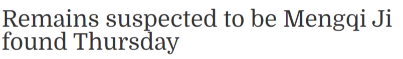 周四,纪梦琪父母的代表萨拉迪(Amy Salladay)向当地媒体证实,他们已接到警方电话被告知最新发现。萨拉迪说,纪的家人还在消化这一消息,对终于找到女儿下落得到一些宽慰。