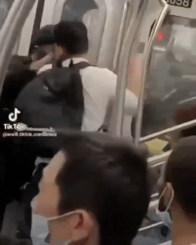 被暴打的亚裔小哥只能蜷缩着身子 双手抱头躲在角落, 一旁的乘客只是伸头观望,
