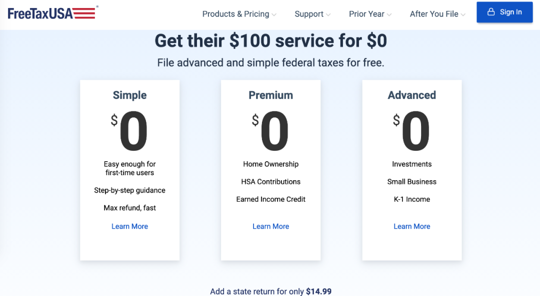 参考网址: https://taxsupport.creditkarma.com/s/article/Forms-and-situations-Credit-Karma-Tax-supports-US 4. myfreetaxes 这款免费报税软件的优点是自助报税不限年龄、收入和州税数量。 参考网址: https://www.myfreetaxes.com/ 5. FreeTax USA 联邦税免费报税,州税付费,可以考虑FreeTax USA 参考网址: