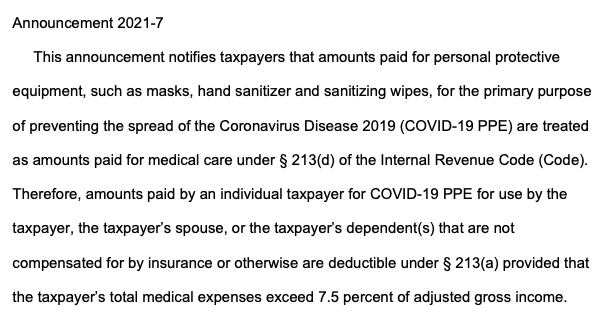 IRS最新声明,为防新冠病毒传播而购买个人防护设备(PPE),如口罩、洗手液、肥皂、一次性手套和消毒湿巾等,属于可扣除的医疗费用。 https://www.irs.gov/pub/irs-drop/a-21-07.pdf