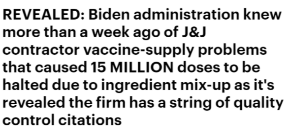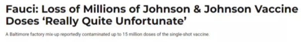 不过就在这条新闻曝光不久,再次有新闻称拜登政府一个多星期前就知道1500万剂强生公司的疫苗被其承包商毁掉,可能会导致疫苗推广的重大延误。