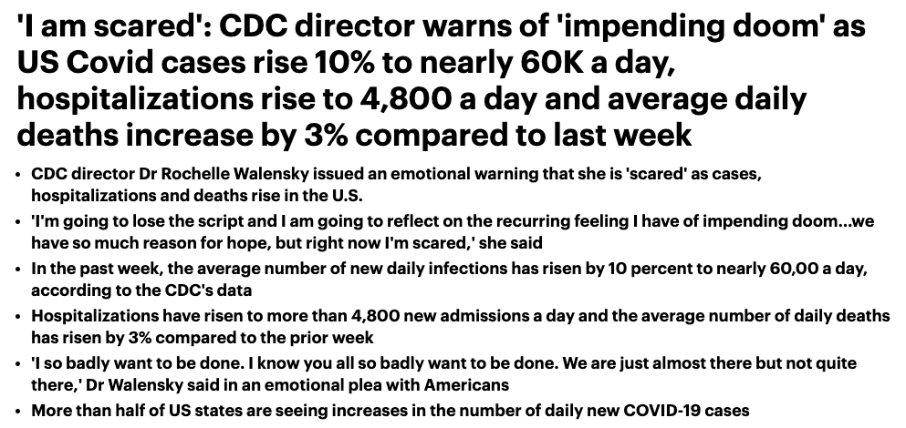 周一,CDC疾控中心主任Rochelle Walensky博士在周一的新闻发布会上情绪激动,表示很害怕、“感觉末日即将来临”,警告美国新冠病例、住院和死亡人数的增加都令人感到不祥。