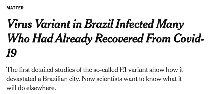 巴西的情况就是如此,新的一波疫情再次席卷巴西,很多曾经感染过新冠病毒并以为自己有了抗体的人再次被感染,全国各地的医院和重症监护室都被感染P.1病毒的人塞满了。