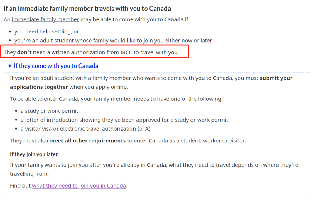 移民局明确指出,不管是未成年留学生需要解决住宿问题;还是成年留学生家属有意向现在或将来前往加拿大,陪读亲属都不需要IRCC的书面授权便可随同入境。