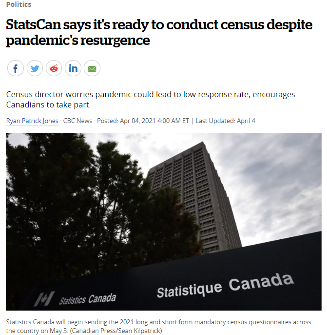 据CBC新闻报道,加拿大国家统计局表示,尽管对未来几个月的新冠大流行情况感到担心,但仍计划在下个月(5月)开展2021年的人口普查。