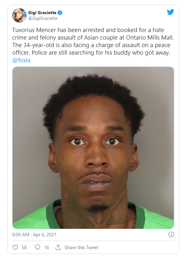 据FOX 11的最新报道,警方已将34岁的Tuvorius Mencer 的黑人男子逮捕归案,涉嫌仇恨罪和重罪殴罪。他还面临对和平官员的殴打指控。警察称,争执升级为身体殴打。警方还在对另外一名黑人嫌犯实施抓捕中。