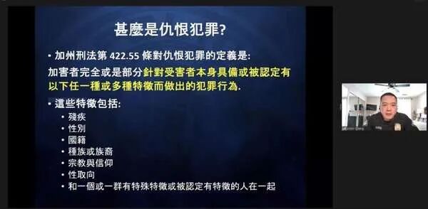 近期,随着仇恨犯罪事件增加,南加州5所大学的校友会联合邀请尔湾警局的华裔警官为市民做了一场对抗仇恨犯罪的讲座,公共信息专员Jordan Liu和张育伟警官详细介绍了什么是仇恨犯罪,并提供了非常实用的应对招数,收到热烈的反响。