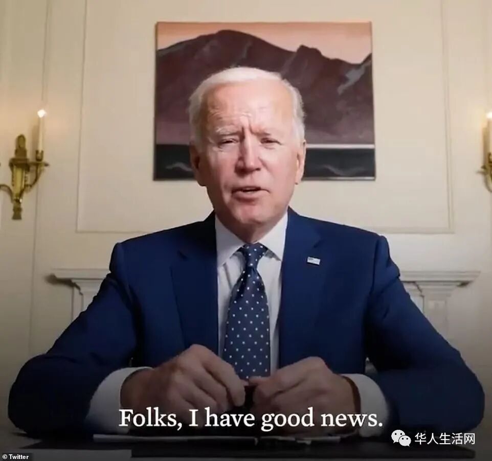 拜登在白宫的一段视频中说:“各位,我有个好消息。“从今天起,每个人都有资格接种疫苗,疫苗我们有的是;你现在只需要被保护,反过来,你也需要保护你的邻居和家人。所以,请接种疫苗吧。”