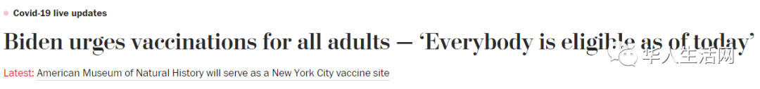 在总统拜登今天发令枪之下,全美16岁以上民众都有权接种疫苗。