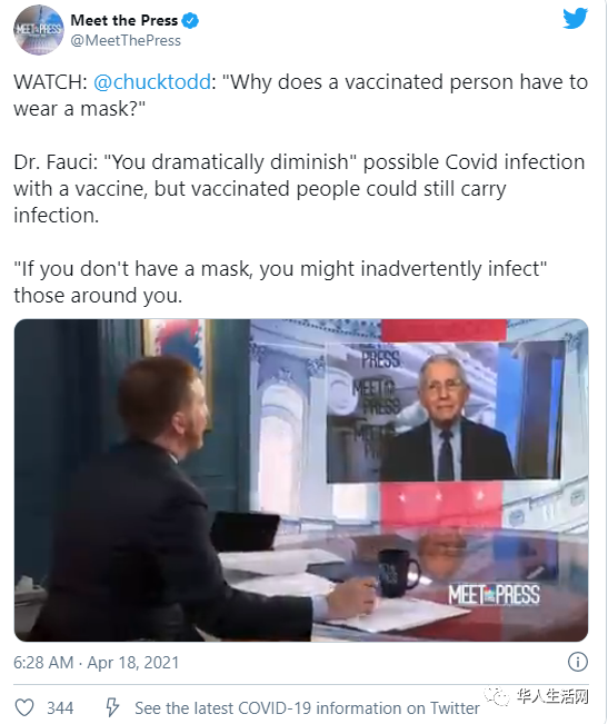 在4月18日上午接受《与媒体见面》(Meet the Press)采访时,福奇表示,随着越来越多的美国人接种新冠疫苗,戴口罩的建议可能会改变。