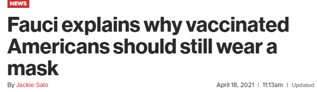 4月18日,美国国家过敏和传染病研究所所长安东尼·福奇博士(Anthony Fauci)表示,接种了新冠疫苗的人仍然应该戴口罩,以免“无意”传播冠状病毒或自己被传染新冠病毒而生病,不过,他也承认这种风险“非常低”。