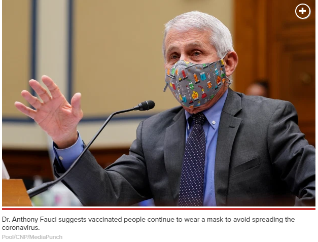 在不同的新闻采访中,福奇都在呼吁人们即使在打了新冠疫苗后,仍然要坚持 戴口罩。