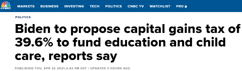 根据CNBC援引自彭博新闻社和《纽约时报》等多家媒体的报道,作为“美国家庭计划”的一部分,拜登将寻求把收入超过100万美元的美国人的资本利得税从20%提高到39.6%,几乎翻了一倍。