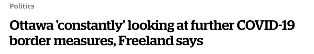 副总理兼财政部长方慧兰(Chrystia Freeland)表示,渥太华正在“不断”地审查并考虑增加其边境限制措施,以防止新冠病毒的传播。