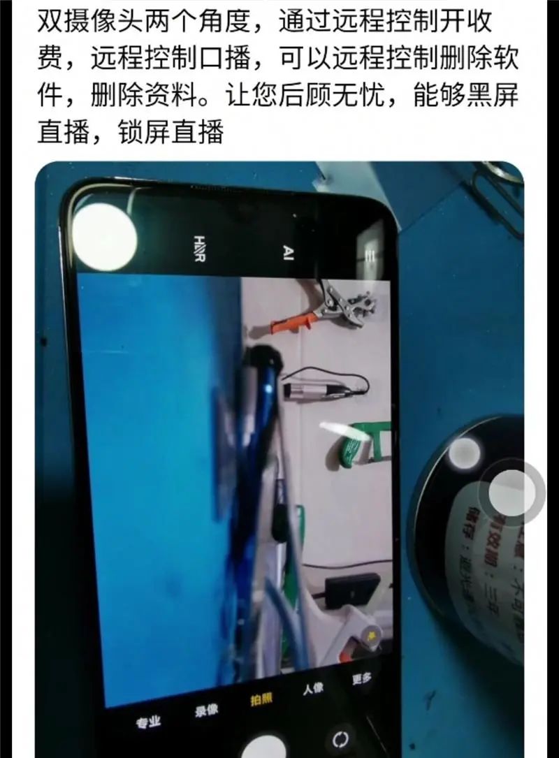 4 月 23 日,记者在某二手交易平台上用相关关键词进行搜索,发现有卖家在销售一部改装过的手机,售价 2599 元,远高于市场均价。图文详情中卖家介绍,不仅拥有双摄像头、两个角度拍摄,还可以远程控制,删除软件、资料,同时还可以在黑屏、锁屏的状态下直播。其演示图中,摄像头被改装到了扬声器孔。有用户留言询问是否是将耳机孔改前置,卖家回复:" 改前面后面都可以。"