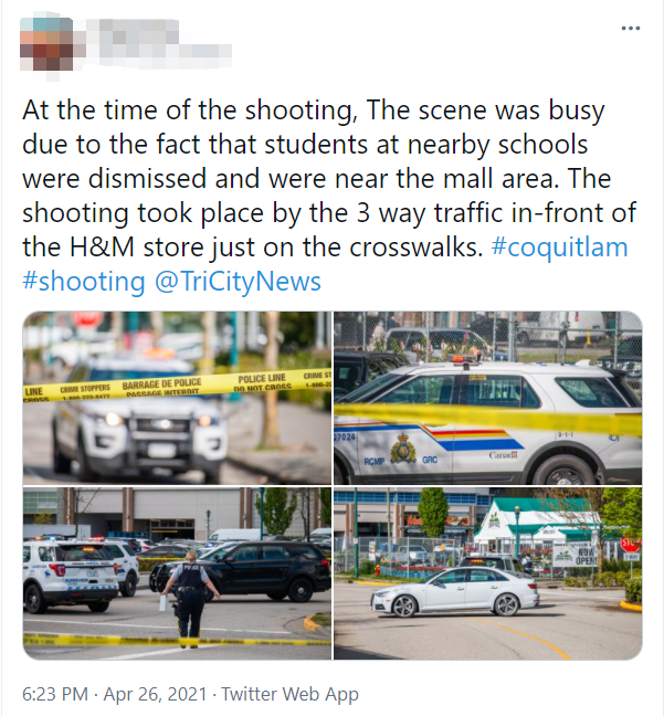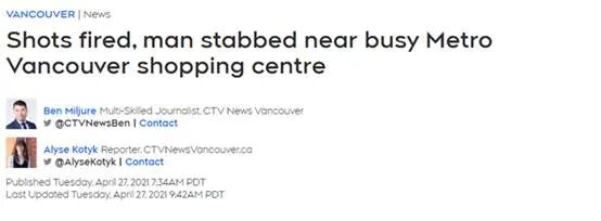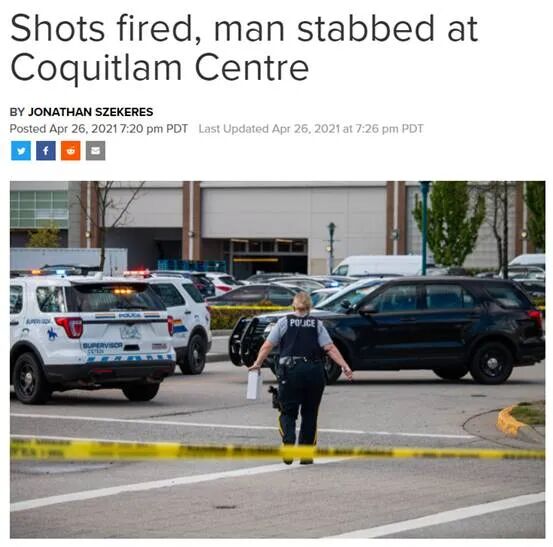 就在大温地区高贵林中心公园爆出枪击案一周后,本周二(4月27日),高贵林购物中心(CoquitlamCentre)再度出事——商场发生枪击事件,1名男子被捅伤!