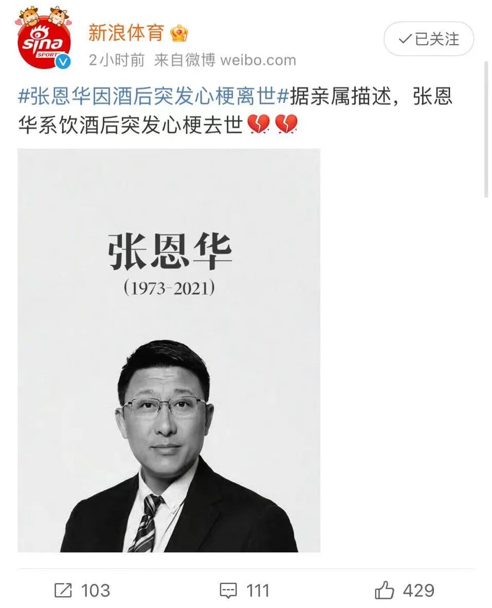 据体坛周报、新浪体育核实 张恩华系饮酒后突发心梗不幸去世。 ↓↓↓