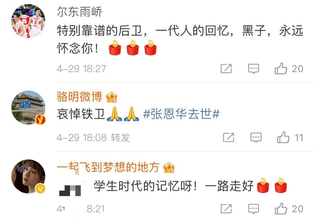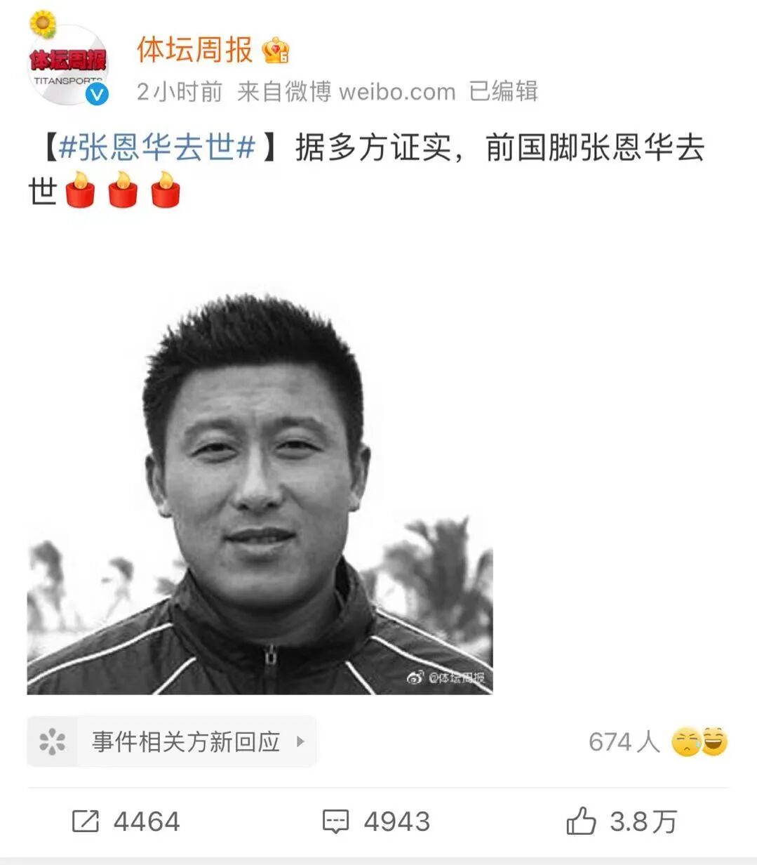 北京时间4月29日, 据体坛周报及多位媒体人消息, 前国足队长张恩华去世 年仅48岁。