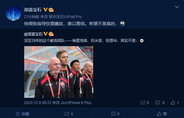 新快报足球记者王敌也在个人微博发布了相关信息:惊闻张指导饮酒遭故,难以置信。希望不是真的。