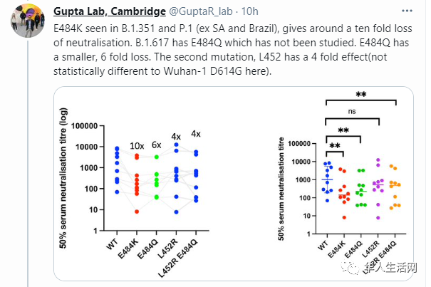 E484Q和L452R对血清中和能力的影响都小于著名的E484K突变,更重要的是,印度变种的这两个重要突变叠加在一起之后,并没有看到血清的中和能力有进一步的下降。