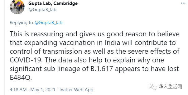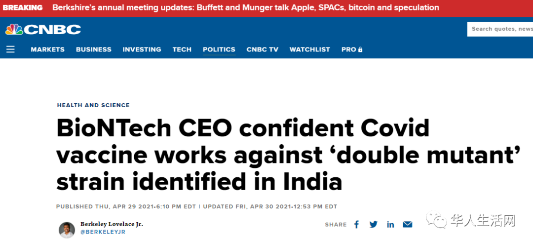 最近BioNTech CEO也表示对辉瑞新冠疫苗对印度发现的“双变异”变种B.1.617有效表示“有信心”。