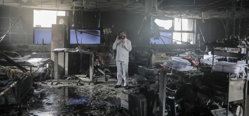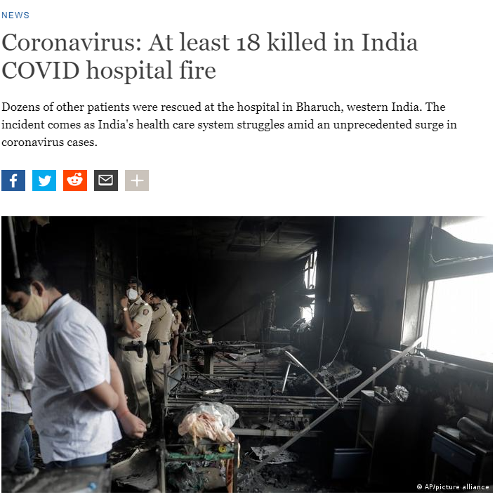 德里和孟买的火葬场也在24小时昼夜不间断的焚烧尸体,甚至单独烧一具尸体的可能性都没有,基本都是几个人放在一起处理后,死者的家人去分一些骨灰带走纪念。 印度的疫情,就连福奇看了都摇头。在最新采访中,他表示“印度正处于非常困难且绝望的境地”。 混乱之中,事故频发。昨天晚上,古吉拉特邦一家专门收治新冠病人的医院发生火灾,整整烧了一个小时!即使救援人员即使赶到,31名患者被顺利救出,医院内还是有18名新冠患者被活活烧死! 据当地媒体报道,火灾可能是因为电路短路而造成的。 这并不是印度第一起医院发生火灾的事件,一周前,4月23日,孟买郊区的一家医院的ICU病房发生火灾,13名病人在痛苦与绝望中,被大火吞噬,最终死亡! 再早些时候,马哈拉施特拉邦的一家公立医院因氧气存储罐泄漏导致氧气供应耗尽,22名患者因此死亡。  警察夺走氧气罐给权贵用导致平民死亡