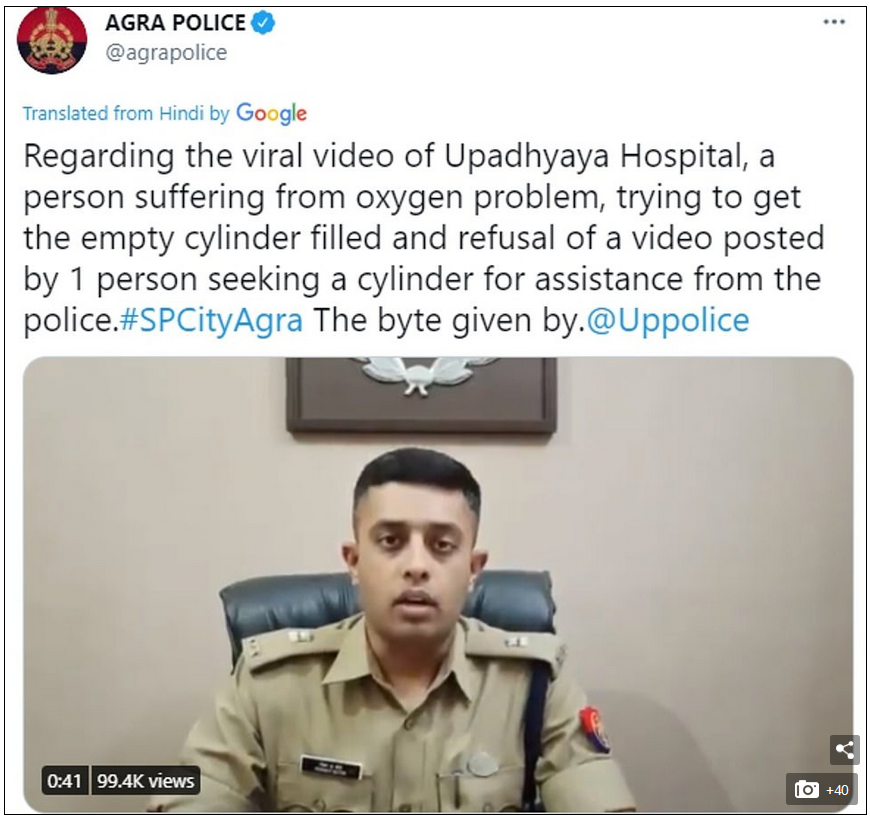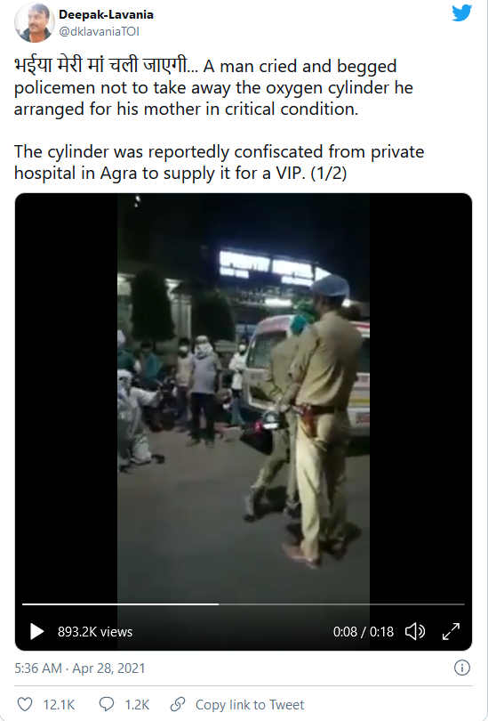 4月28日,一位网友在Twitter上发布文章和视频称,在北方邦阿格拉市的一家私人医院外,一位男子的母亲因被警察强制夺走氧气罐而濒临死亡,导致他不得不跪在地上乞求警察,痛哭流涕。该事件背景是由于印度日增近40万新冠患者,致使目前的氧气瓶严重短缺,当地卫生系统早已不堪重负。