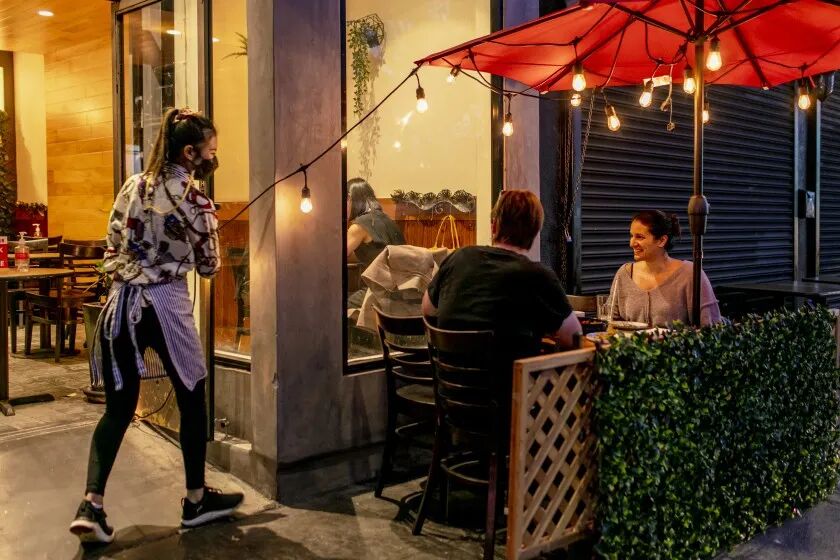 (2021年4月30日,一对男女在梅尔罗斯大道的餐厅用餐。/洛杉矶时报)