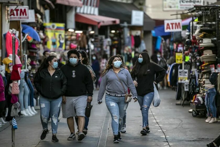 (购物者走在洛杉矶市中心的桑蒂小巷。/洛杉矶时报)