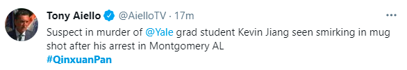 历时三个多月,跨越多半个美国,涉嫌枪杀耶鲁大学26岁华裔硕士生蒋凯文(Kevin Jiang)的29岁麻省理工学院(MIT)学生潘勤轩(Qinxuan Pan,音译)13日在阿拉巴马州落网。