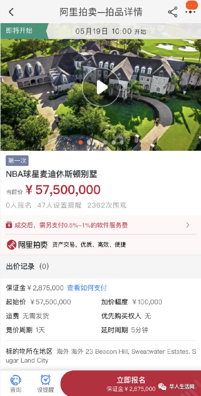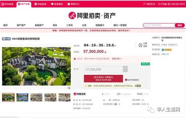在阿里拍卖平台,笔者留意到,标注为“NBA球星麦迪休斯敦别墅”的房产已经上架公示,而此前已经吸引了1.3万多次围观。