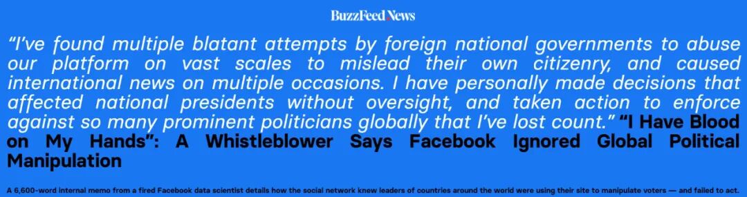 “在Facebook的三年中,我发现外国政府多次公然企图大规模滥用我们的平台来误导本国公民,并多次引发国际新闻。”