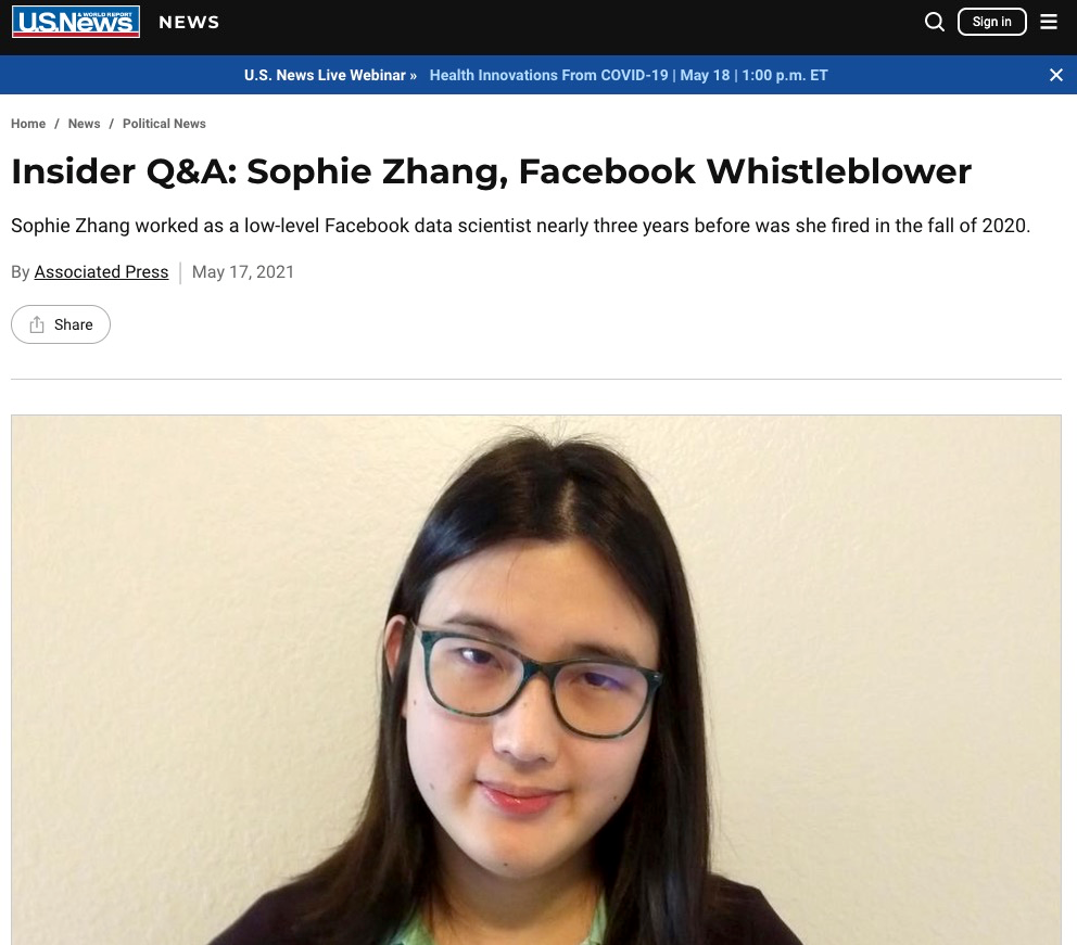 最近,美国各大媒体都被一位Facebook辞退的前华人女码农Sophie Zhang刷屏了!