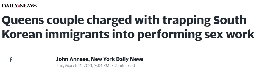 纽约法拉盛有一对亚裔夫妻,以招工为由诱骗两名韩国女子来到纽约,没收了她们的护照,然后强迫她们卖春赚钱;两人不久前因再度胁迫受害女子而被捕。