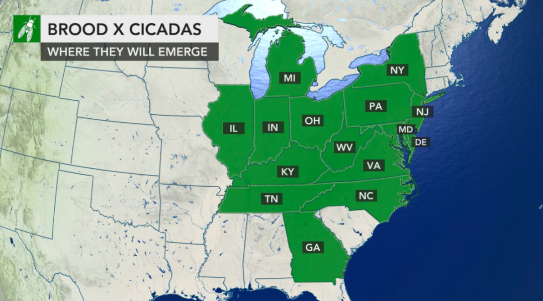 昆虫专家预计,从佐治亚到纽约州,从伊利诺伊到特拉华,从5月末到本周,都会相继有大量的Brood X 幼虫,密密麻麻从土里钻出,爬上枝头,羽化成蝉,振翅疾鸣,演绎这这一17年1次的世界奇观。