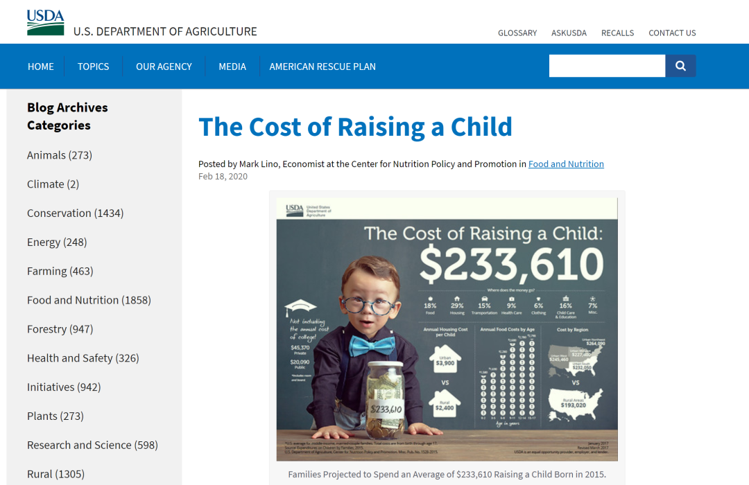 事实上,美国农业部每年都会计算养一个孩子的总成本